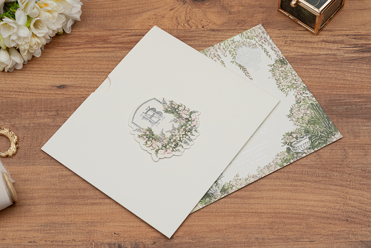 Ağaç Tasarım Yaldız Baskı Kart ve Yaldız Baskılı Çiçekli Zarflı Davetiye
