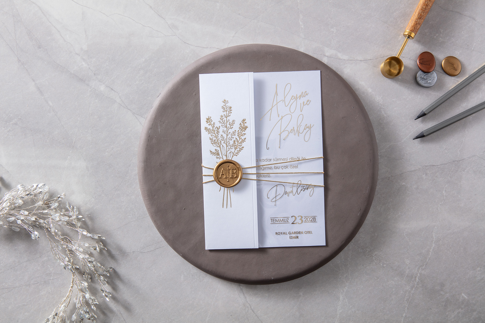Beyaz Katlama Zarflı Mühürlü ve Yaldız Çiçekli Şeffaf Davetiye