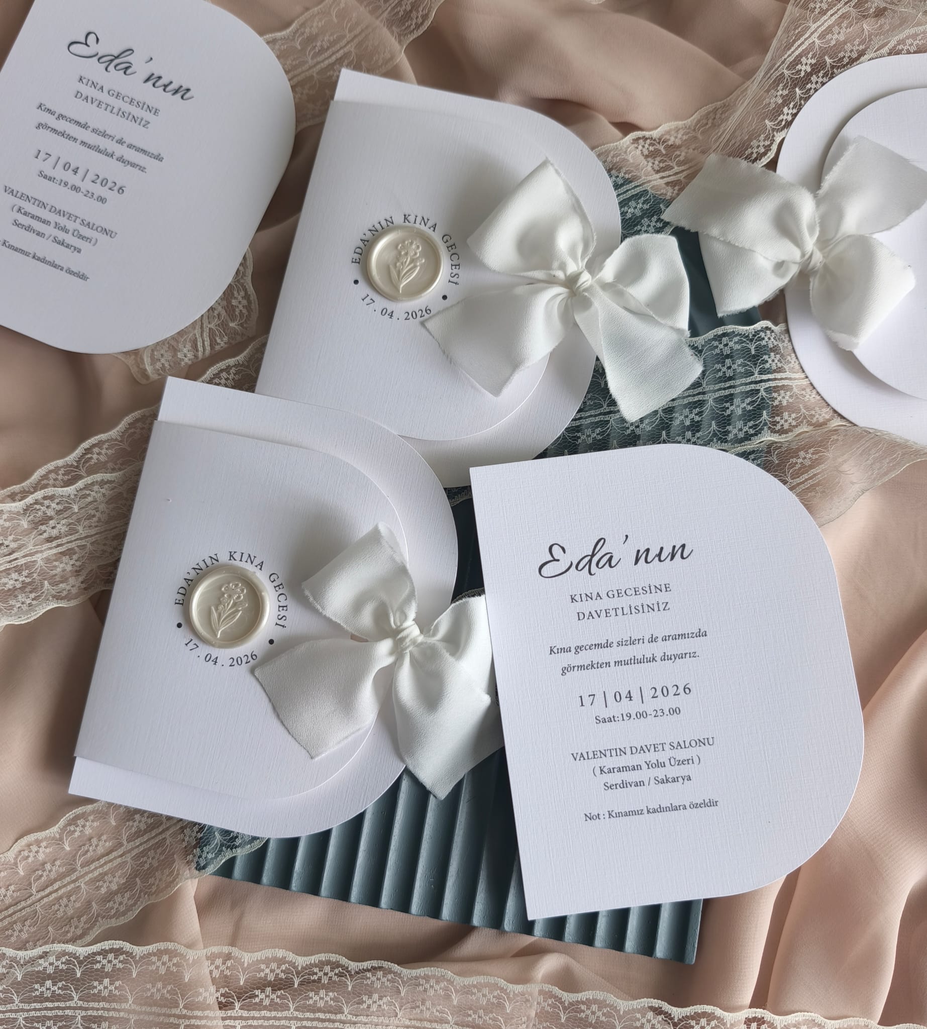 Beyaz Renkli Özel Kesim Katlamalı Zarflı Mühürlü Kurdeleli Kına Davetiyesi