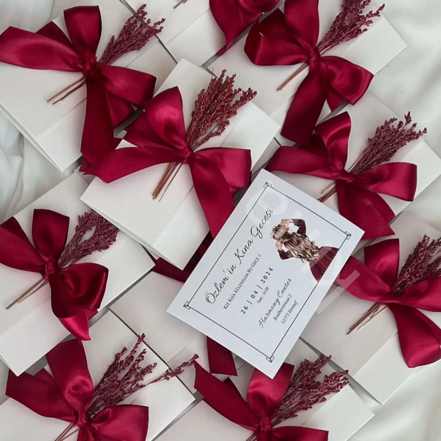 Bordo Renkli Fiyonklu ve Çiçek Süslemeli Bordo Gelin Resimli Kına Davetiyesi