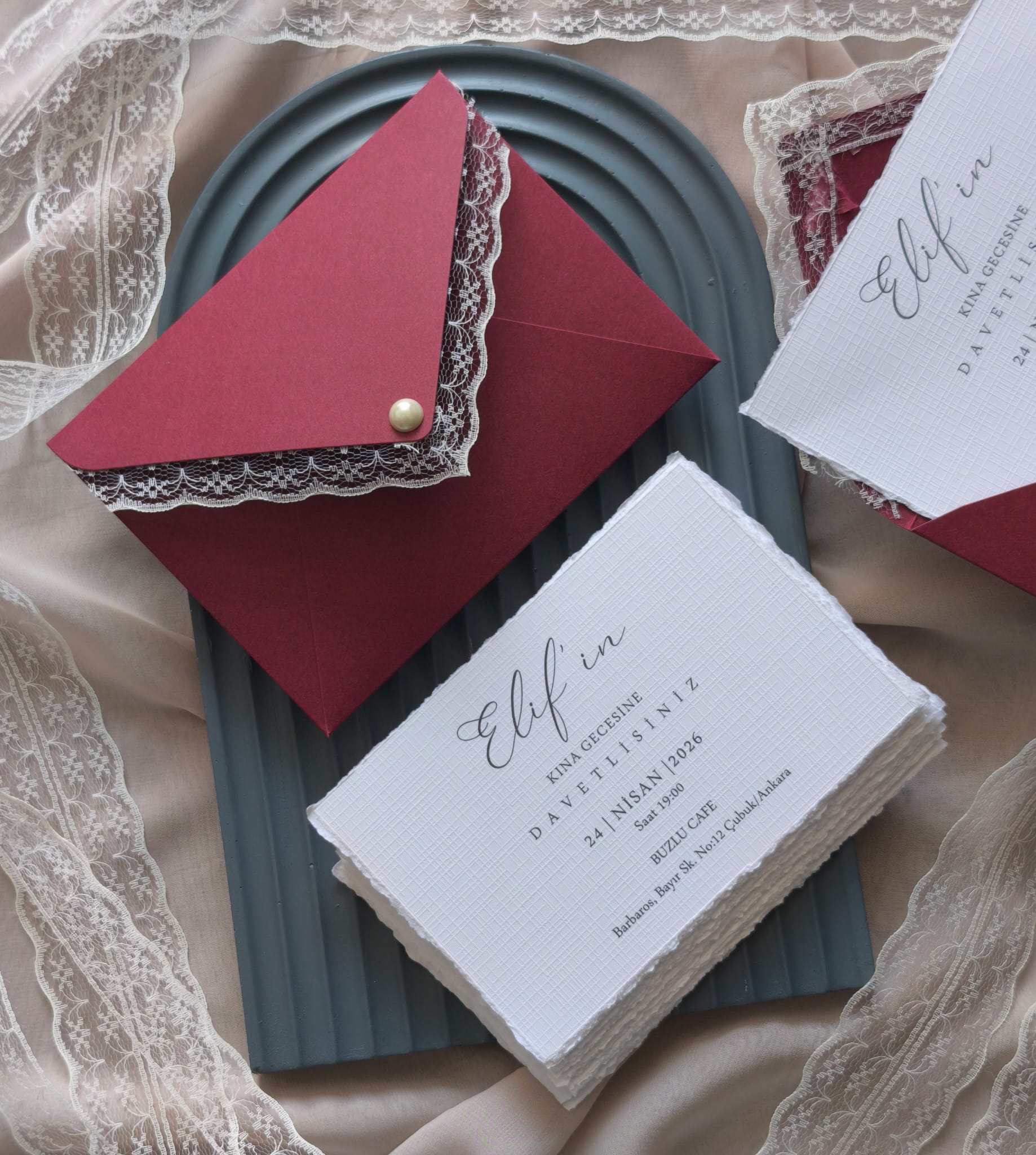Bordo Renkli Zarf Kenarları Dantel Süslemeli İncili Kına Davetiyesi