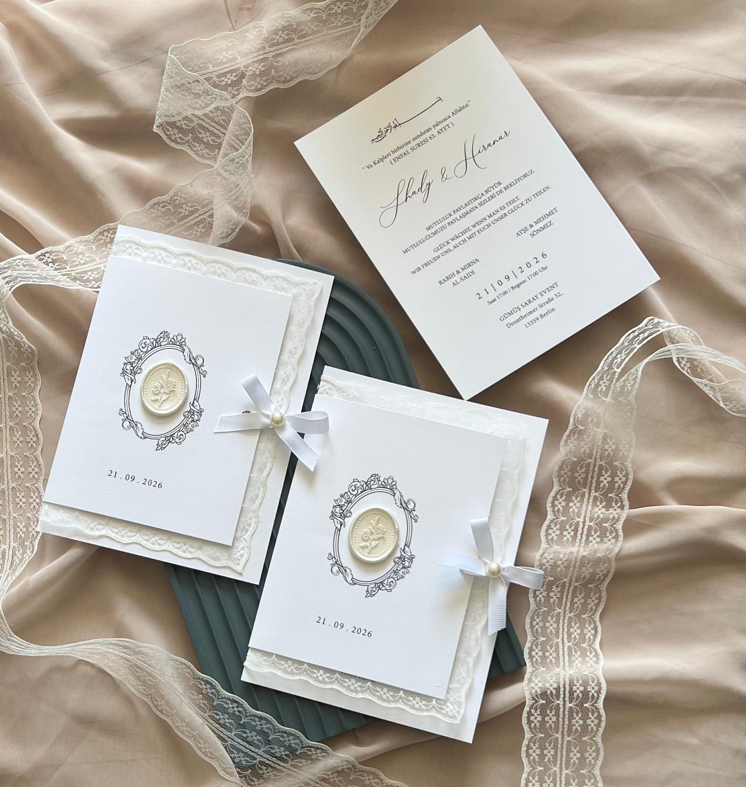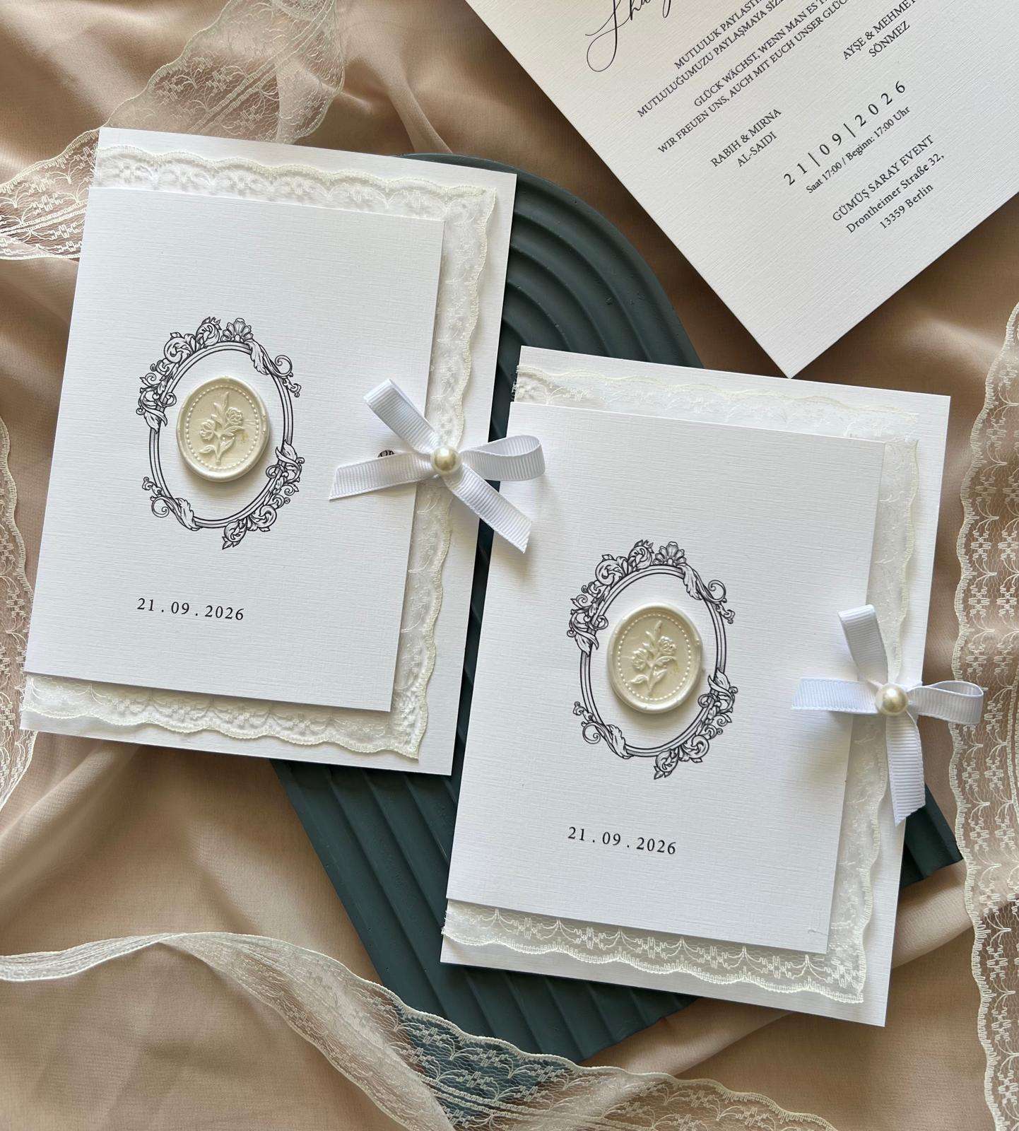 Yarım Kapak Kendinden Zarflı Dantel Süslemeli Dokulu Kağıt Frame Baskılı Mühürlü Lüks Davetiye