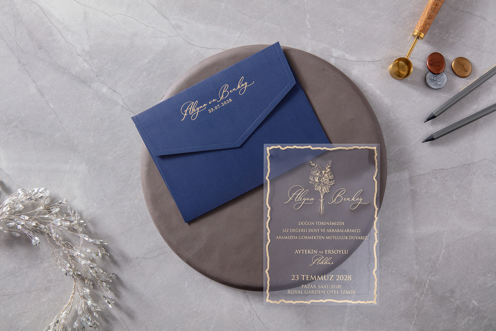 Şeffaf Kart Yaldız Baskılı Lacivert Renkli ve Yaldız Baskılı Zarflı Davetiye
