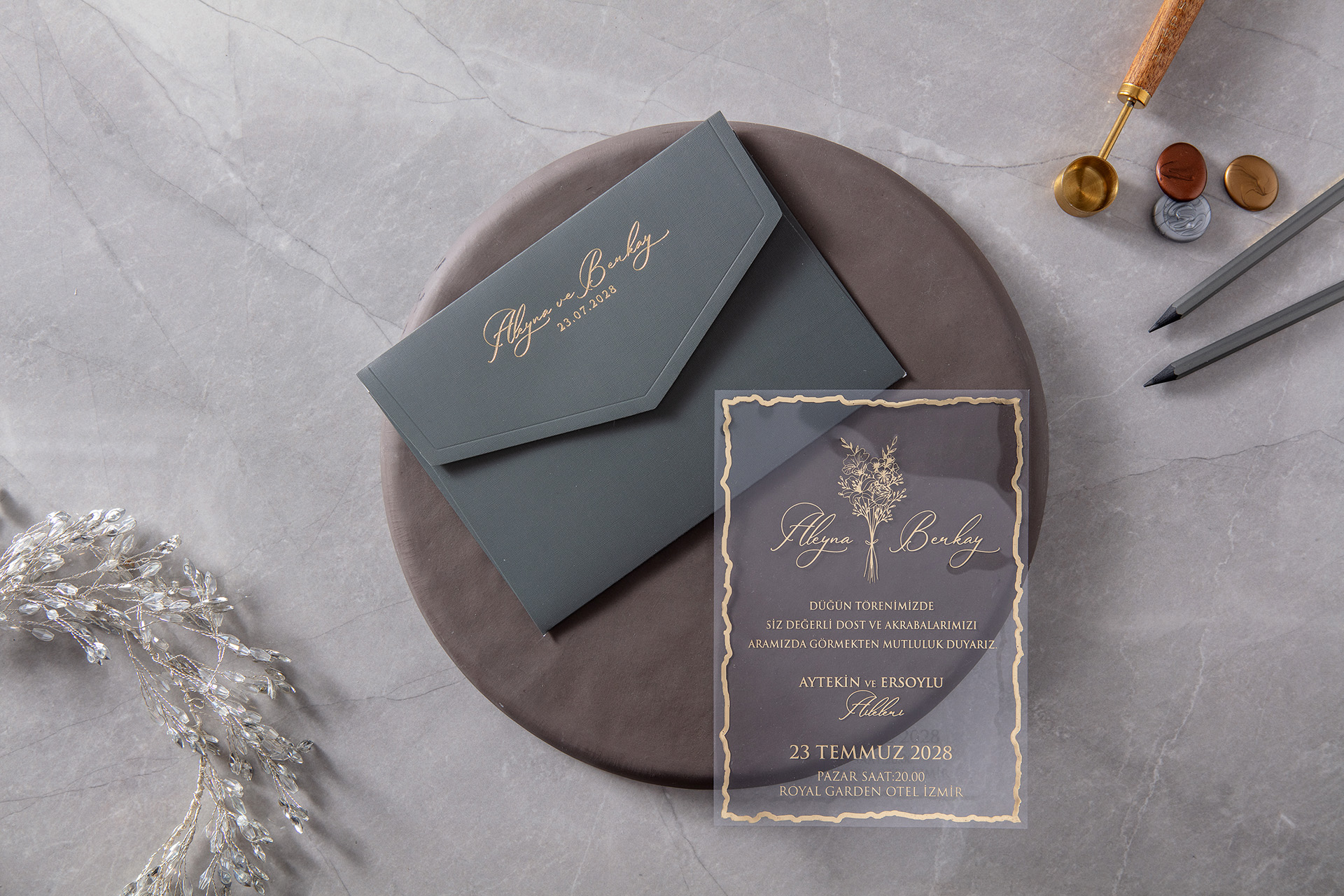 Şeffaf Kart Yaldız Baskılı Yeşil Renkli Zarflı Davetiye