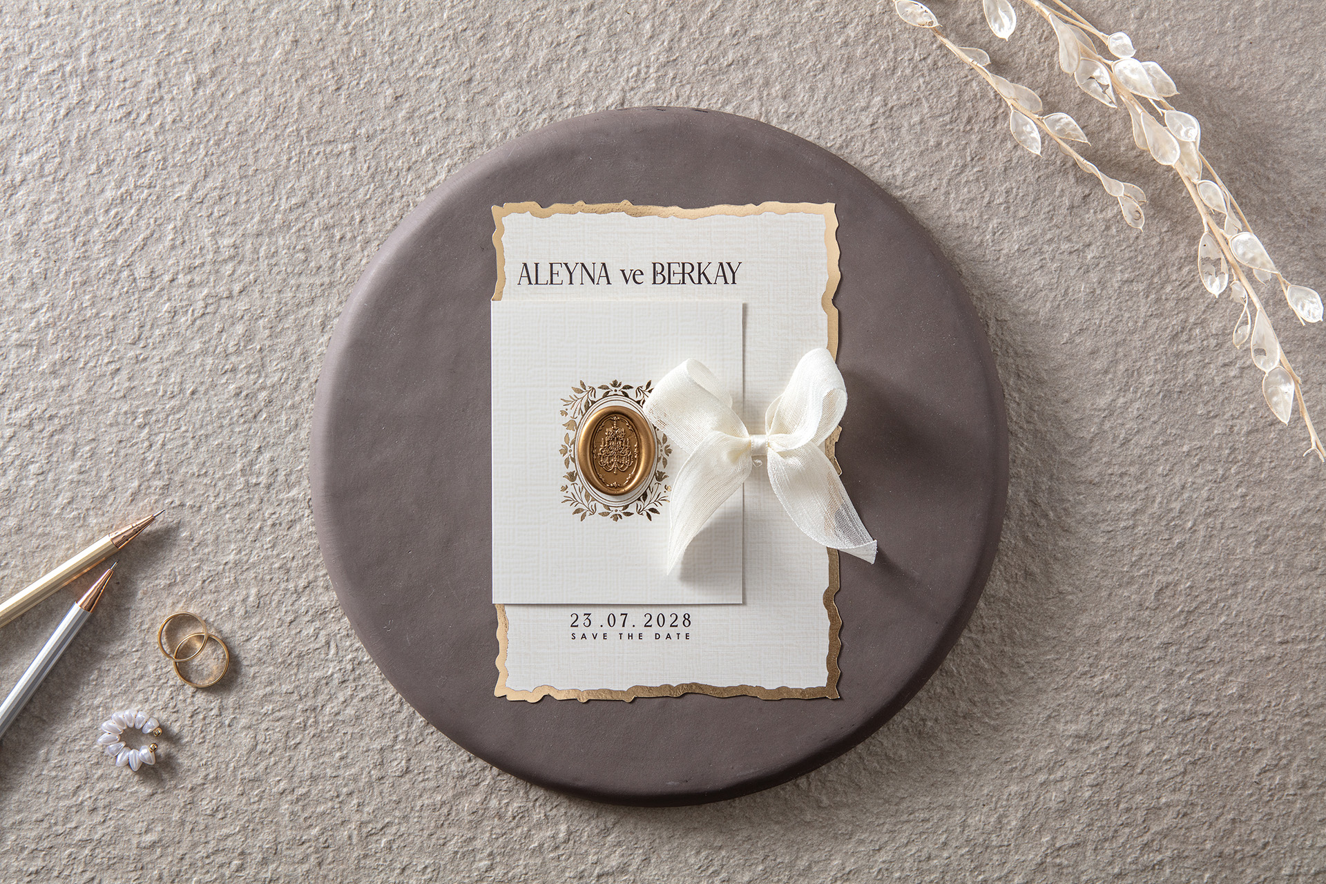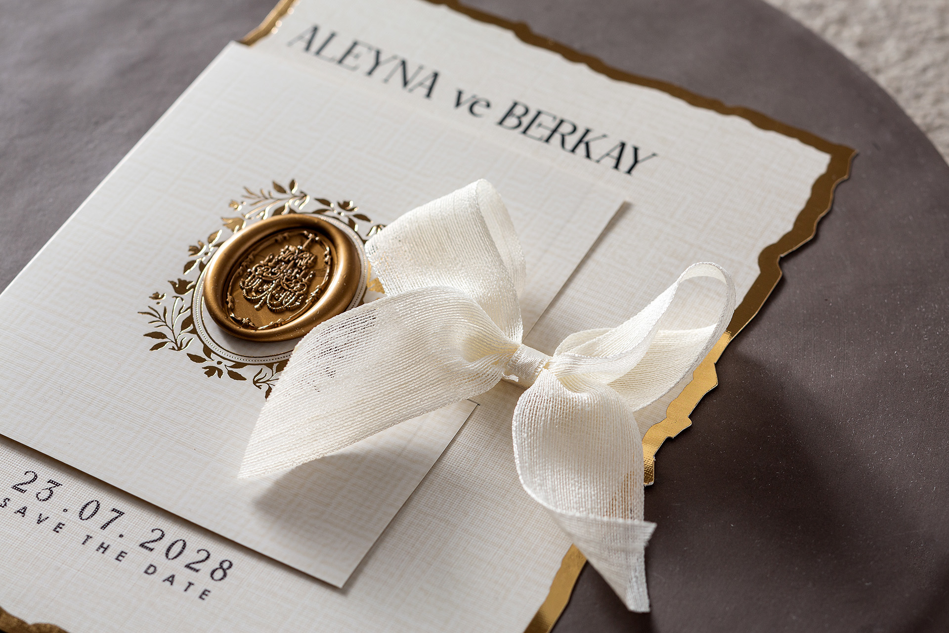 Yaldız Baskılı Şerit Süslemeli Mühürlü ve Kurdele Süslemeli Davetiye